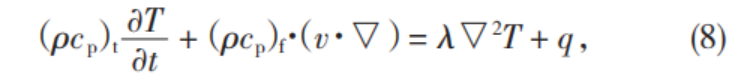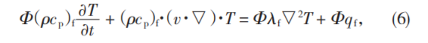 式(6)—式(7)中,ρ為密度,kg/m3;cp為比熱容,J(/kg·K);(ρcp)f為多孔介質(zhì)流相中總的體積比熱容,J/m3;T為溫度,K;t為時間,s;λf為液體導熱系數(shù),W(/m·K);qf為液體內(nèi)熱源強度,W;(ρcp)s為多孔介質(zhì)固相中總的體積比熱容,J/m3。將式(6)與式(7)相加,可導出單相流體的多孔介質(zhì)的能量方程為: